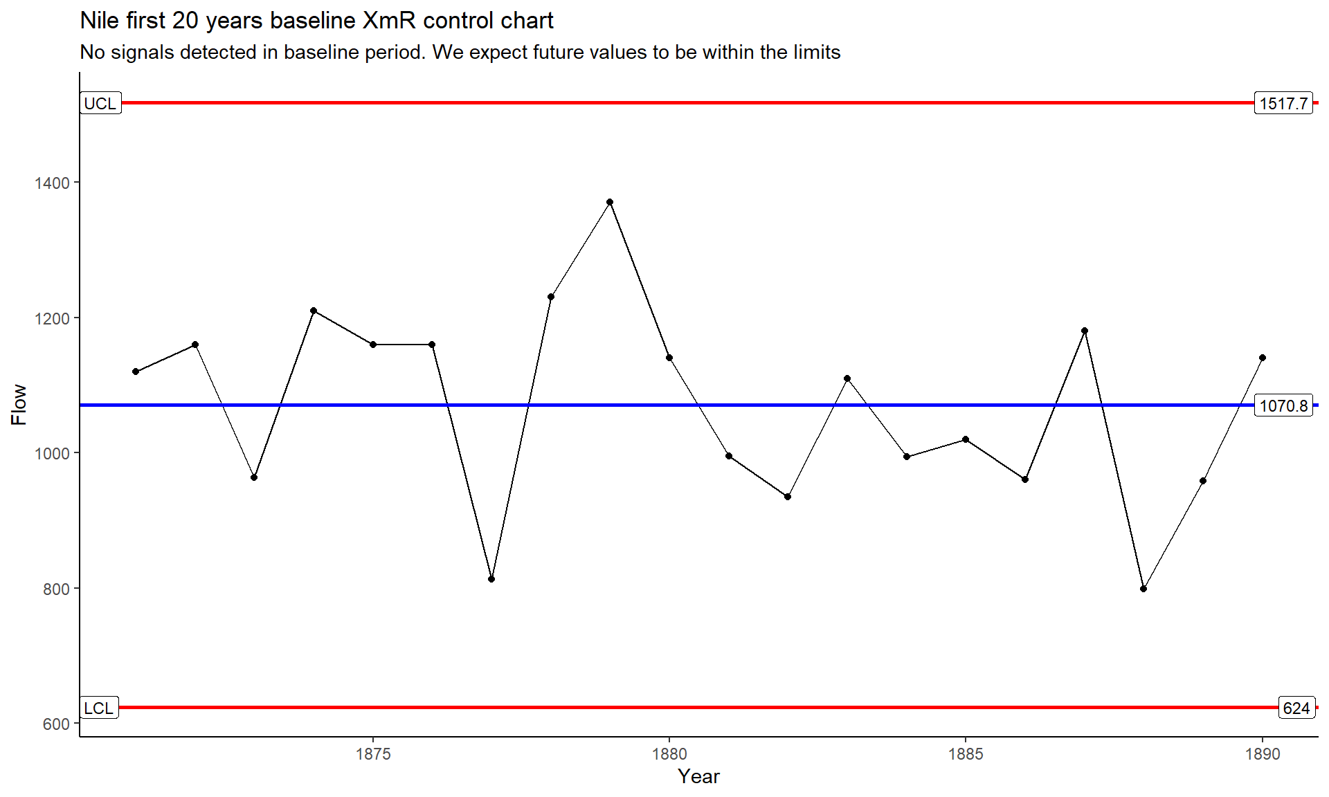 labs(title = "Nile first 20 years baseline XmR control chart",