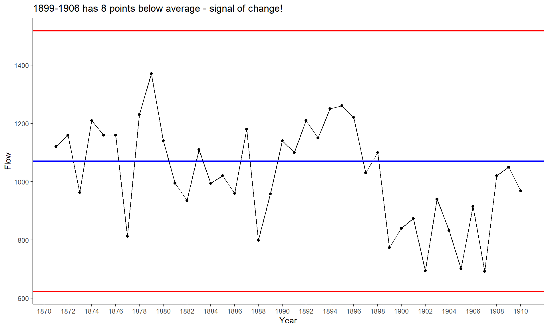 We see a sudden drop around 1899 - but is this evidence of a change in the process? By 1906 there are 8 points below the average, indicating that this probably is a real change. The points I chose to display here continue to be below the average - it looks like this shift lower is real.