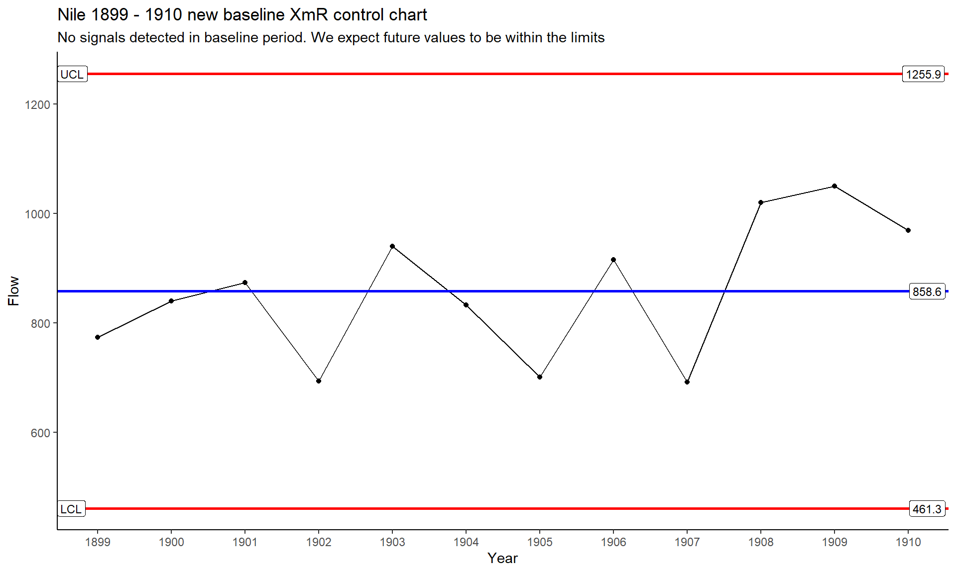 labs(title = "Nile 1899 - 1910 new baseline XmR control chart",